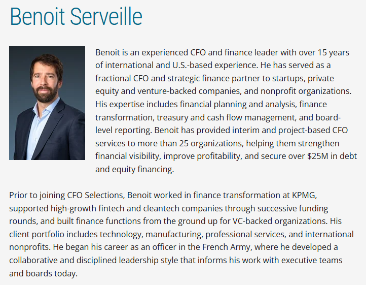 Prior to joining CFO Selections, Benoit worked in finance transformation at KPMG, supported high-growth fintech and cleantech companies through successive funding rounds, and built finance functions from the ground up for VC-backed organizations. His client portfolio includes technology, manufacturing, professional services, and international nonprofits. He began his career as an officer in the French Army, where he developed a collaborative and disciplined leadership style that informs his work with executive teams and boards today.