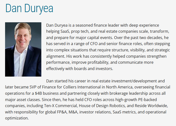 Dan Duryea is a seasoned finance leader with deep experience helping SaaS, prop tech, and real estate companies scale, transform, and prepare for major capital events. Over the past two decades, he has served in a range of CFO and senior finance roles, often stepping into complex situations that require structure, visibility, and strategic alignment. His work has consistently helped companies strengthen performance, improve profitability, and communicate more effectively with boards and investors.