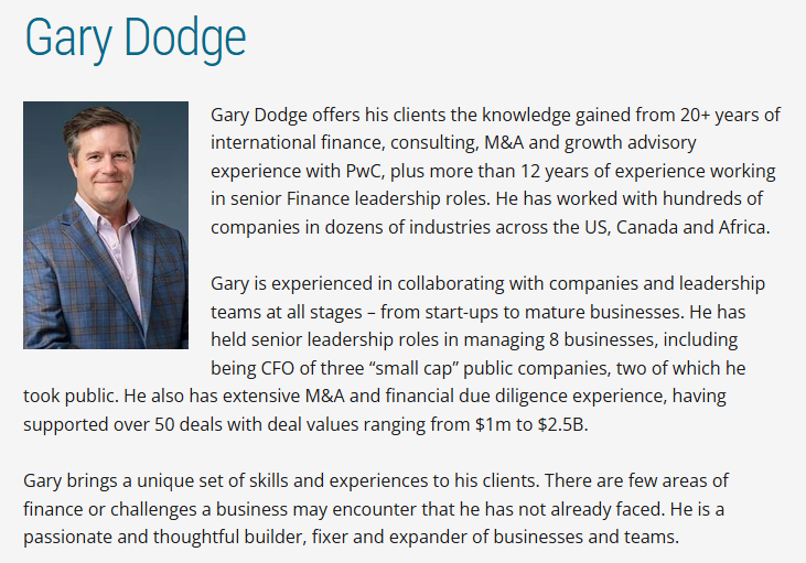 Gary Dodge offers his clients the knowledge gained from 20+ years of international finance, consulting, M&A and growth advisory experience with PwC, plus more than 12 years of experience working in senior Finance leadership roles. He has worked with hundreds of companies in dozens of industries across the US, Canada and Africa.