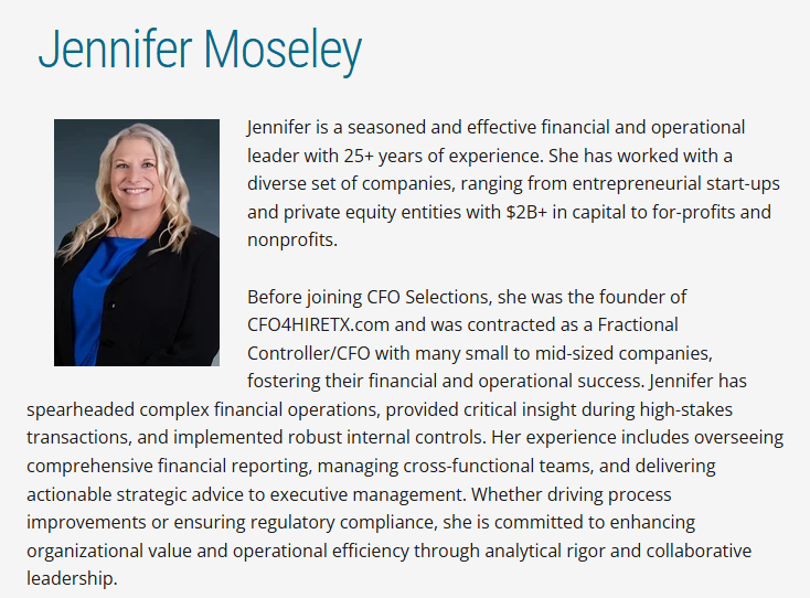 Before joining CFO Selections, she was the founder of CFO4HIRETX.com and was contracted as a Fractional Controller/CFO with many small to mid-sized companies, fostering their financial and operational success. Jennifer has spearheaded complex financial operations, provided critical insight during high-stakes transactions, and implemented robust internal controls. Her experience includes overseeing comprehensive financial reporting, managing cross-functional teams, and delivering actionable strategic advice to executive management. Whether driving process improvements or ensuring regulatory compliance, she is committed to enhancing organizational value and operational efficiency through analytical rigor and collaborative leadership.