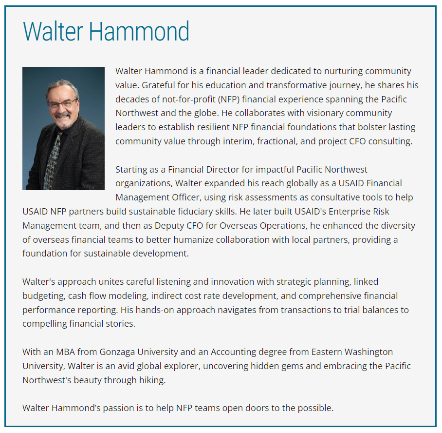 Walter Hammond is a financial leader dedicated to nurturing community value. Grateful for his education and transformative journey, he shares his decades of not-for-profit (NFP) financial experience spanning the Pacific Northwest and the globe. He collaborates with visionary community leaders to establish resilient NFP financial foundations that bolster lasting community value through interim, fractional, and project CFO consulting.