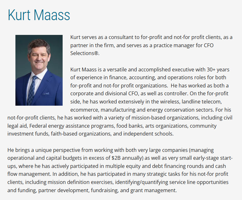 Kurt Maass is a versatile and accomplished executive with 30+ years of experience in finance, accounting, and operations roles for both for-profit and not-for profit organizations. He has worked as both a corporate and divisional CFO, as well as controller. On the for-profit side, he has worked extensively in the wireless, landline telecom, ecommerce, manufacturing and energy conservation sectors. For his not-for-profit clients, he has worked with a variety of mission-based organizations, including civil legal aid, Federal energy assistance programs, food banks, arts organizations, community investment funds, faith-based organizations, and independent schools.