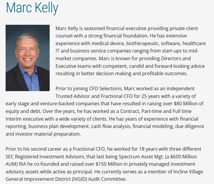 Prior to his second career as a Fractional CFO, he worked for 18 years with three different SEC Registered Investment Advisors, that last being Spectrum Asset Mgt. (a $600 Million AUM) RIA he co-founded and raised over $150 Million in privately managed investment advisory assets while active as principal. He currently serves as a member of Incline Village General Improvement District (IVGID) Audit Committee.