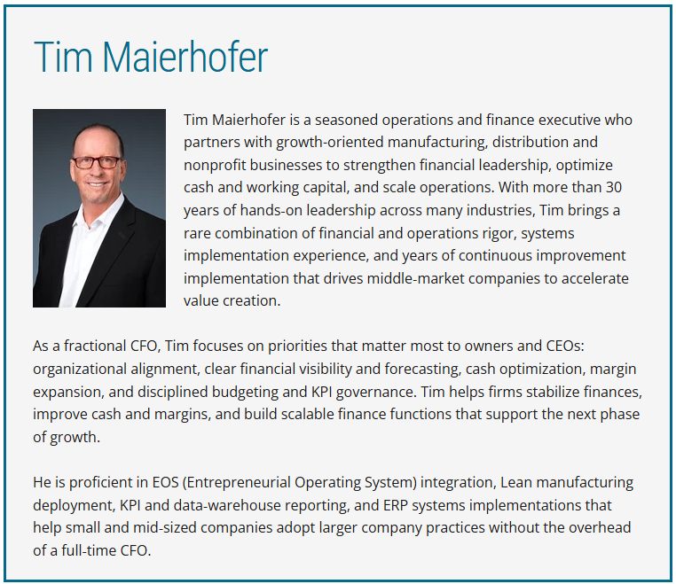 Tim Maierhofer is a seasoned operations and finance executive who partners with growth-oriented manufacturing, distribution and nonprofit businesses to strengthen financial leadership, optimize cash and working capital, and scale operations. With more than 30 years of hands‑on leadership across many industries, Tim brings a rare combination of financial and operations rigor, systems implementation experience, and years of continuous improvement implementation that drives middle‑market companies to accelerate value creation.